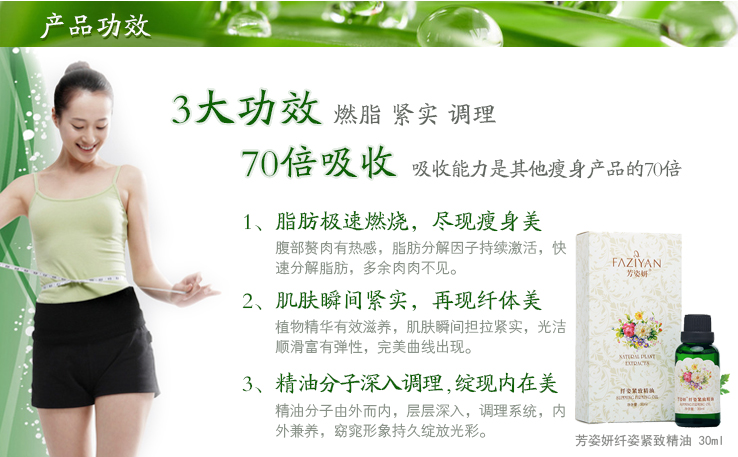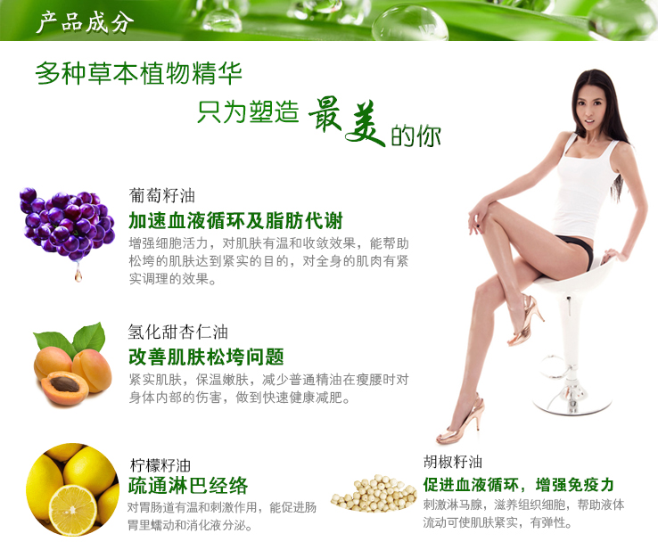 提取方法 植物提取 功效 保養(yǎng),減肥,滋潤,放松活絡(luò),塑形纖體 護(hù)理部位 臀部,腿部,腰部,身體